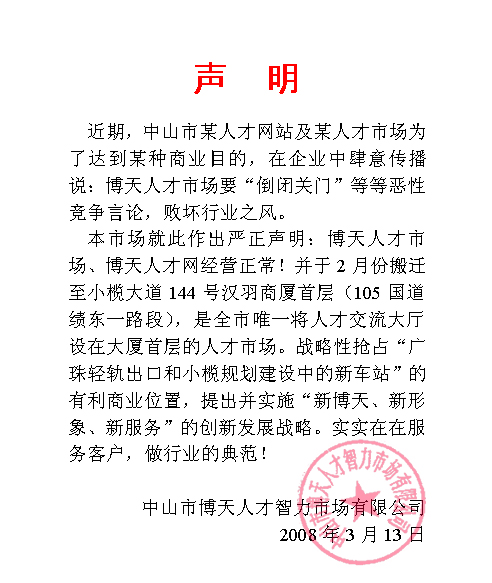 呵呵呵!中山某个大型人才网了出声明之后博天也出声明了!有些小网部就喜欢搞这个胡乱攻击!